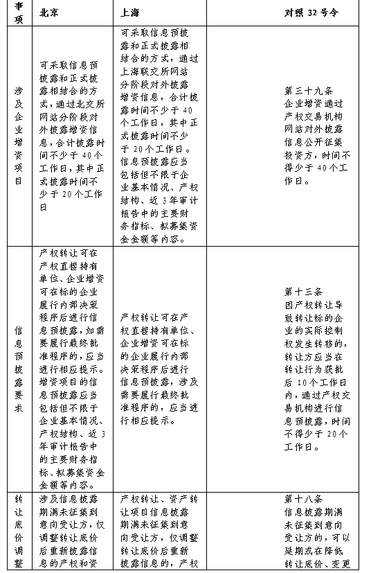 六、企業(yè)增資可采取信息預(yù)披露和正式披露相結(jié)合的方式,通過產(chǎn)權(quán)交易機構(gòu)網(wǎng)站分階段對外披露增資信息,合計披露時間不少于40個工作日,其中正式披露時間不少于20個工作日。信息預(yù)披露應(yīng)當(dāng)包括但不限于企業(yè)基本情況、產(chǎn)權(quán)結(jié)構(gòu)、近3年審計報告中的主要財務(wù)指標(biāo)、擬募集資金金額等內(nèi)容。七、產(chǎn)權(quán)轉(zhuǎn)讓可在產(chǎn)權(quán)直接持有單位、企業(yè)增資可在標(biāo)的企業(yè)履行內(nèi)部決策程序后進行信息披露,涉及需要履行最終批準(zhǔn)程序的,應(yīng)當(dāng)進行相應(yīng)提示。(與32號文相應(yīng)規(guī)定相比,將增資行為作為法定信息披露的內(nèi)容)
